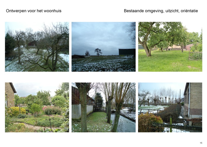 Het woonhuis met garage. De kavelvorm, het bestaande woonhuis, het gele vlak als nieuwe aanbouw. Het gearceerde gedeelte is een stuk grond met een grote boerenschuur die later is aangekocht en bij het plan is betrokken.