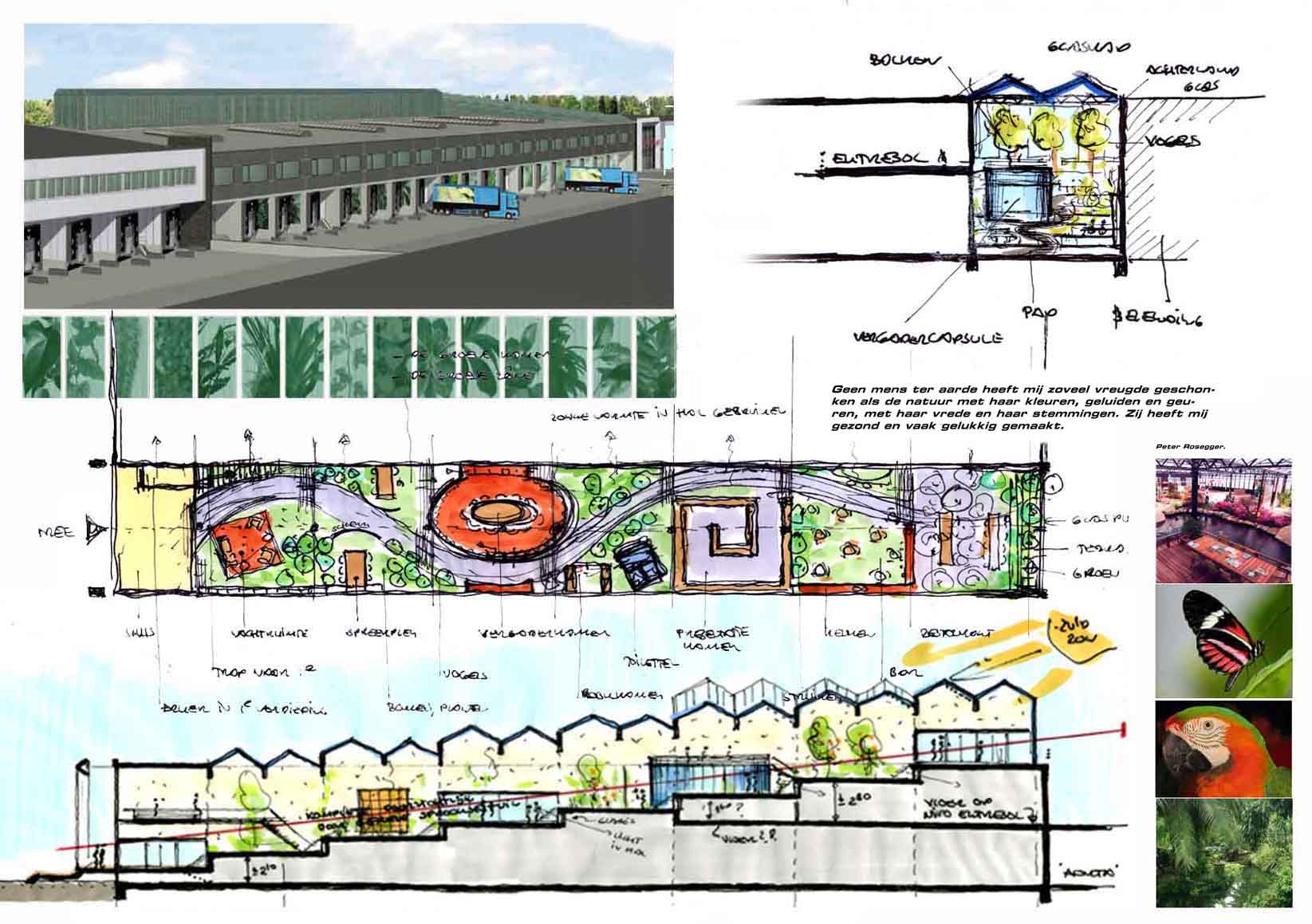 Presentatieruimte in het bedrijfsgebouw van ‘Vida Verde’ in Honselersdijk Rijkelijk laat werd gevraagd om een presentatieruimte te bedenken in een reeds ontworpen bedrijfsgebouw wat ook al in aanbouw was. Het bedrijf exporteerde planten en aanverwante artikelen. Door op het dak een kas te plaatsen, waar het kweken van de planten kon worden getoond, en het maken van een oplopende presentatieruimte van de entree naar deze kas op het dak, kon met minimale verstoring van het in gang zijnde proces, worden voldaan aan de vraag. In de presentatieruimte komen vogels, vlinders, planten en bloemen en een waterbeekje voor. Werkzaam als verantwoordelijk project-architect