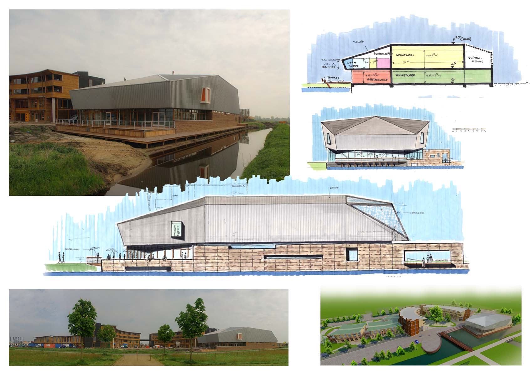 Sportgebouw in het Multi Functioneel Centrum “Skoatterwold’ in Heerenveen Dit sportgebouw is onderdeel van een groter complex aan de rand van Heerenveen. Uitdaging was om met minimale middelen en toevoegen van maatschappelijke voorzieningen die geld opleverde, het sportgebouw te financieren. Op de verdieping de sportvoorzieningen met een buitenveld op het terras. Op de begane grond de verschillende maatschappelijke voorzieningen als een politiepost, een supermarkt, gemeentelijke informatiecentrum en een horecavoorziening. Werkzaam als meewerkend project-architect
