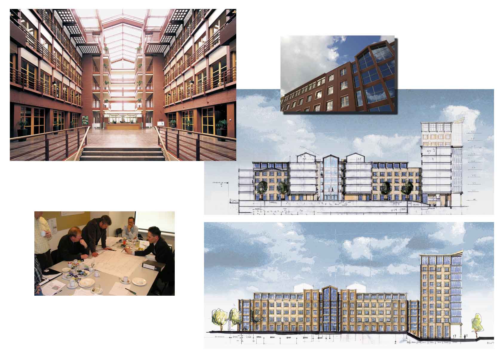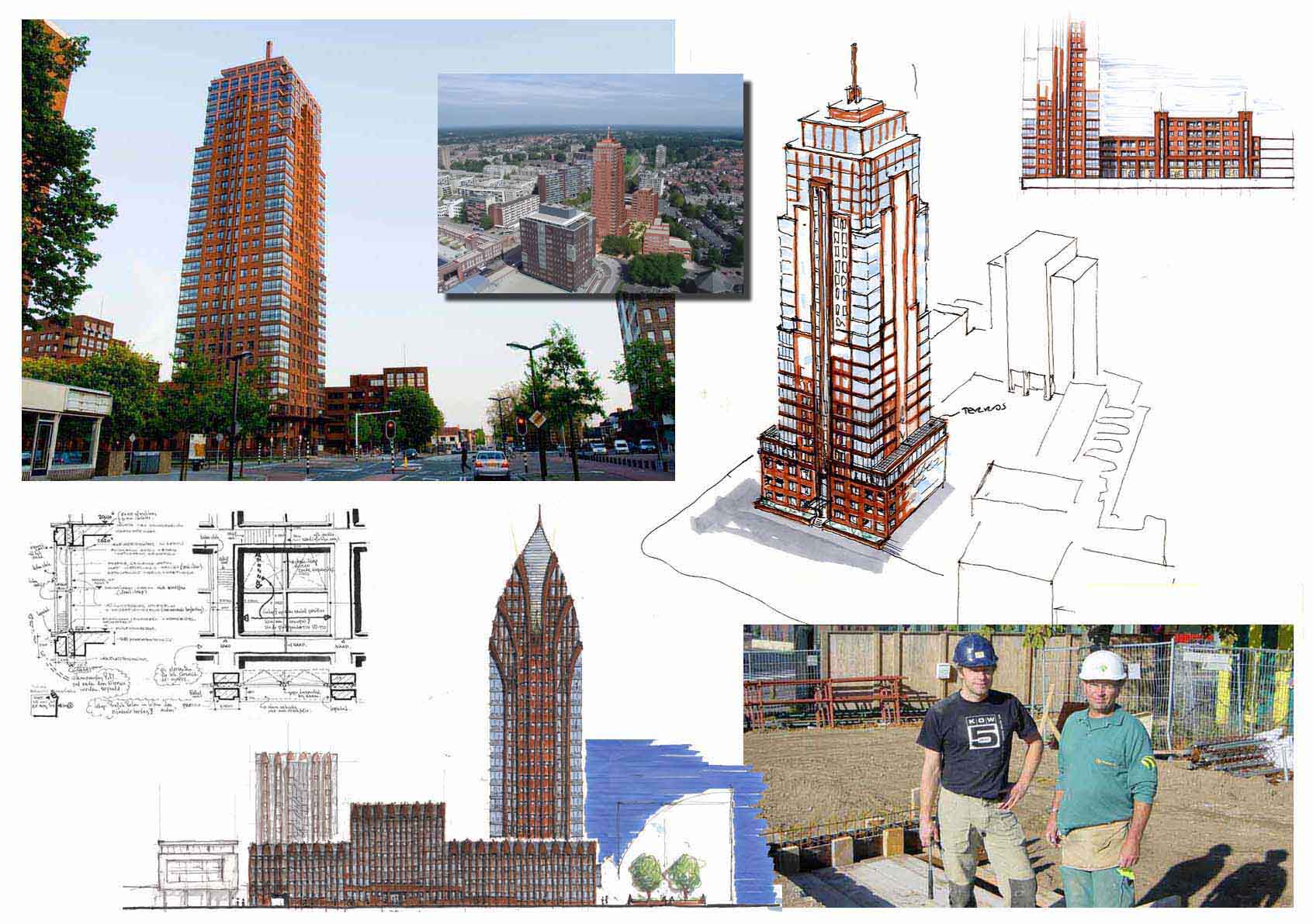 Wooncomplex ‘De Boulevard’ in Enschede Een binnenstedelijk wooncomplex met gedifferentieerde woningtypologieën, commerciële ruimtes, parkeersouterrain aan een gemeenschappelijke stadstuin. De wens van de opdrachtgever was om de hoogste toren van Twente te bouwen. Na veel overleg en het toevoegen van een ‘openbaar’ observatiedek in de toren op 104 meter hoogte, ging de gemeente akkoord en kon worden begonnen met de uitvoering. Werkzaam als verantwoordelijk project-architect