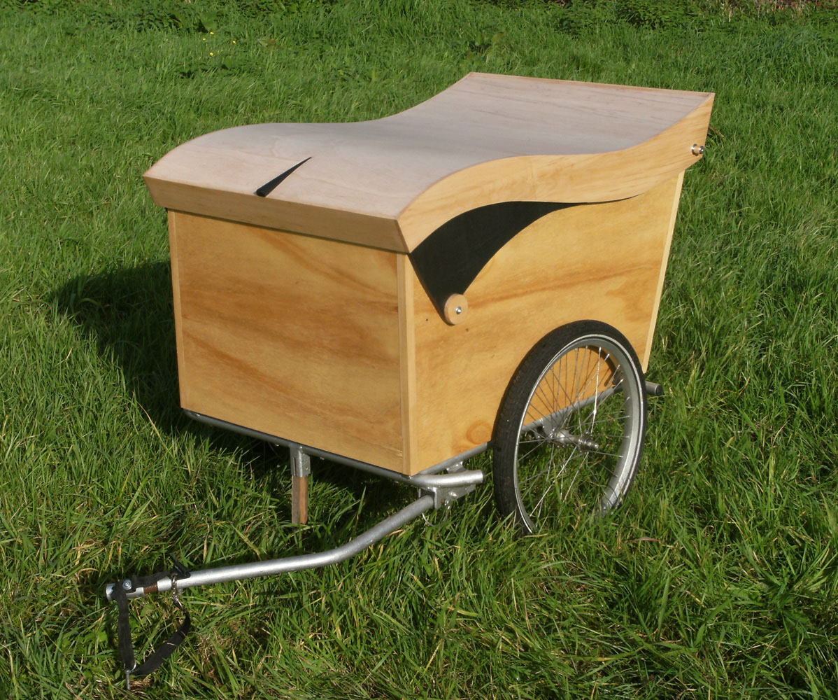Deze fietskar is gebouwd op een oud frame van een kinderfietskar gevonden bij het vuil. Om gewicht te besparen is gebruik gemaakt van 9mm plaatmateriaal, massief essenhout en buigbeuken. Het geheel is 3x afgelakt met een transparante lak. Totale gewicht is ongeveer 38 kilo. Scharnierende kap blijft openstaan zonder hulpmiddelen.Twee drukcilinders zorgen dat de kar afgesloten kan worden en dat de kap niet open kan springen tijdens het fietsen. De achterwand kan eruit geschoven worden om bijvoorbeeld langere voorwerpen te vervoeren.