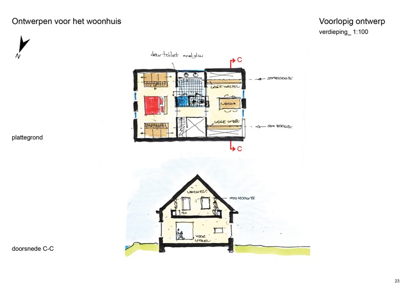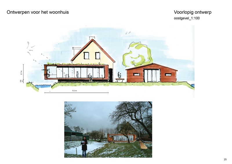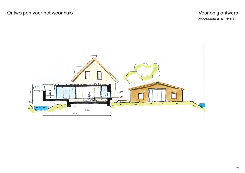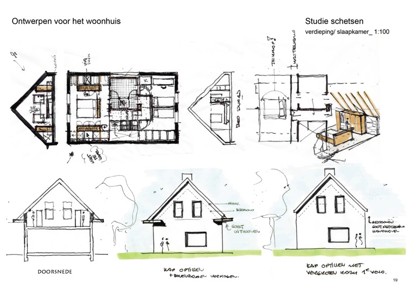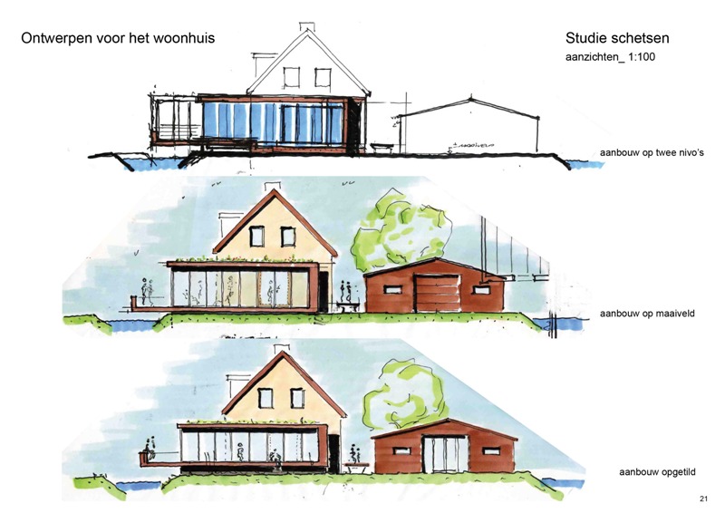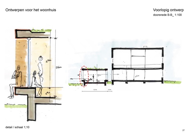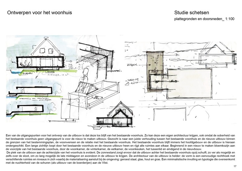 Ontwerpschets bestaande woning en nieuwe aanbouw met detail