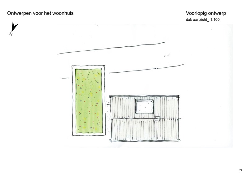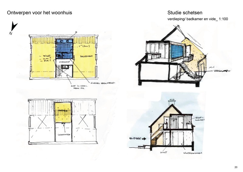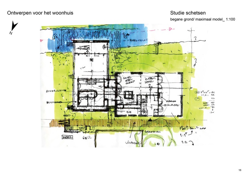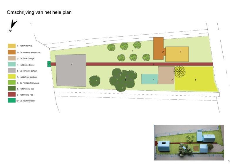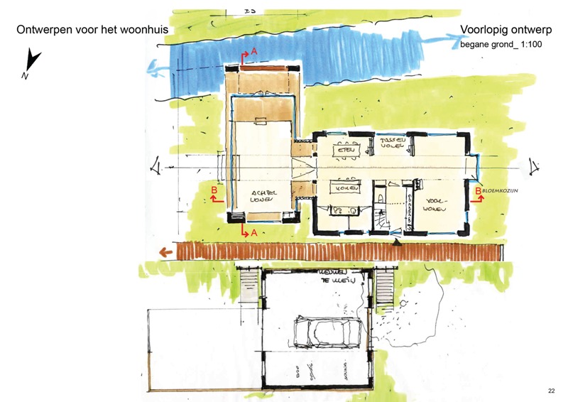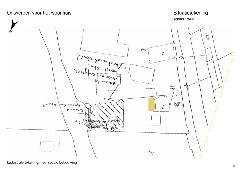 Het woonhuis met garage. De kavelvorm, het bestaande woonhuis, het gele vlak als nieuwe aanbouw. Het gearceerde gedeelte is een stuk grond met een grote boerenschuur die later is aangekocht en bij het plan is betrokken.