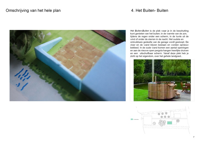 Het Buiten-Buiten is de plek waar je in de beschutting kunt genieten van het buiten; in de warmte van de zon, tijdens de regen onder een scherm, in de luwte uit de wind of onder de sterren in de nacht. Het oudste en onbruikbare gedeelte van de garage wordt gesloopt. De vloer en de wand blijven bestaan en worden opnieuw bekleed. In de oude wand komen een aantal openingen en aan de nieuwe open pergola hangen heerlijke druiven en een uitschuifbaar scherm. Vanaf deze plek heb je zicht op het eigendom, over het gehele landgoed.