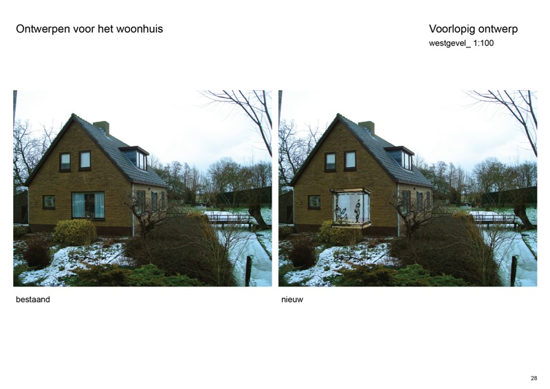 Een van de uitgangspunten voor het ontwerp van de uitbouw is dat deze los blijft van het bestaande woonhuis. Zo kan deze een eigen architectuur krijgen, ook omdat de soberheid van het bestaande woonhuis geen uitgangspunt is voor de nieuw te maken uitbouw. Gezocht is naar een juiste verhouding tussen het bestaande woonhuis en de nieuwe uitbouw binnen de grenzen van het bestemmingsplan, de woonwensen en de relatie met het bestaande woonhuis. Het bestaande woonhuis blijft immers het hoofdgebouw en de uitbouw is hieraan ondergeschikt. Een lange zichtlijn loopt door het bestaande woonhuis en de nieuwe uitbouw heen en rijgt alle ruimtes aan elkaar. Beginnend in een nieuw te maken bloemkozijn aan de voorzijde van het bestaande woonhuis, door de woonkamer, de winterkamer, de eetkamer, de woonkeuken, het tussenlid en eindigend in de nieuwbouw.