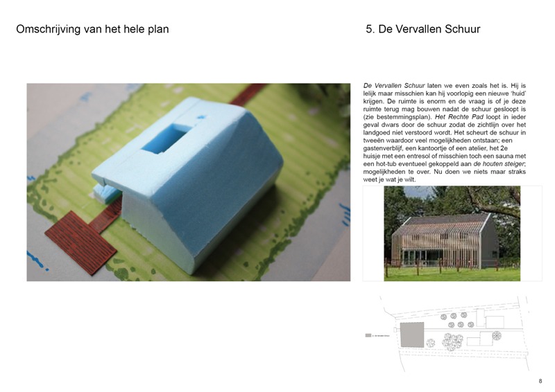 De Vervallen Schuur laten we even zoals het is. Hij is lelijk maar misschien kan hij voorlopig een nieuwe ‘huid’ krijgen. De ruimte is enorm en de vraag is of je deze ruimte terug mag bouwen nadat de schuur gesloopt is (zie bestemmingsplan). Het Rechte Pad loopt in ieder geval dwars door de schuur zodat de zichtlijn over het landgoed niet verstoord wordt. Het scheurt de schuur in tweeën waardoor veel mogelijkheden ontstaan; een gastenverblijf, een kantoortje of een atelier, het 2e huisje met een entresol of misschien toch een sauna met een hot-tub eventueel gekoppeld aan de houten steiger; mogelijkheden te over. Nu doen we niets maar straks weet je wat je wilt.