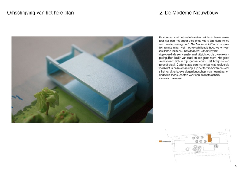 Als contrast met het oude komt er ook iets nieuws waardoor het één het ander versterkt; ‘wit is pas echt wit op een zwarte ondergrond’. De Moderne Uitbouw is maar één ruimte maar wel met verschillende hoogtes en verschillende ‘buitens’. De Moderne Uitbouw wordt uitgevoerd als een venster met uitzicht op de groene omgeving. Een kozijn van staal en een groot raam. Het grote raam vouwt zich in zijn geheel open. Het kozijn is van geroest staal, Cortenstaal; een materiaal wat veelvuldig voorkomt in deze omgeving. Op het terras boven de sloot is het karakteristieke slagenlandschap waarneembaar en biedt een mooie opstap voor een schaatstocht in winterse maanden.