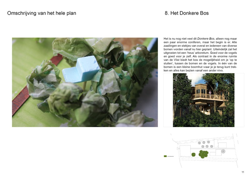 8. Het Donkere Bos Het is nu nog niet veel dit Donkere Bos, alleen nog maar een paar enorme coniferen, maar het begin is er. Alle zaailingen en stekjes van overal en iedereen van diverse bomen worden vanaf nu hier geplant. Uiteindelijk zal het uitgroeien tot een ‘heus’ arboretum. Goed voor de vogels en goed voor je zelf. Als contrast in de enorme ruimte van de Vlist biedt het bos de mogelijkheid om je ‘op te sluiten’, tussen de bomen en de vogels. In één van de bomen is een kleine boomhut waar je je terug kunt trekken en alles kan bezien vanaf een ander nivo.