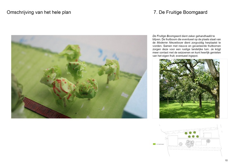 De Fruitige Boomgaard dient zeker gehandhaafd te blijven. De fruitboom die eventueel op de plaats staat van de Moderne Nieuwbouw dient zorgvuldig herplaatst te worden. Samen met nieuwe en gevarieerde fruitbomen zorgen deze voor een rustige landelijke tuin. Je krijgt meer contact met de seizoenen en kunt heerlijk genieten van het eigen fruit; eventueel ingepot.
