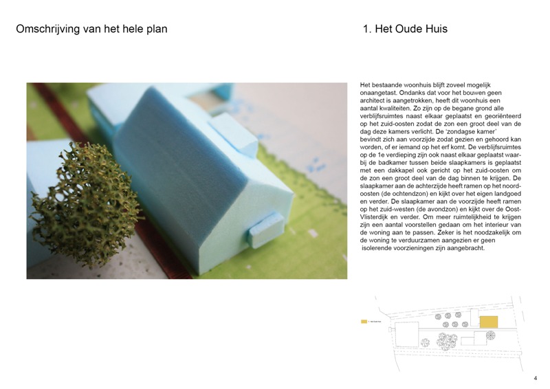 Het bestaande woonhuis blijft zoveel mogelijk onaangetast. Ondanks dat voor het bouwen geen architect is aangetrokken, heeft dit woonhuis een aantal kwaliteiten. Zo zijn op de begane grond alle verblijfsruimtes naast elkaar geplaatst en georiënteerd op het zuid-oosten zodat de zon een groot deel van de dag deze kamers verlichten. De ‘zondagse kamer’ bevindt zich aan voorzijde zodat gezien en gehoord kan worden, of er iemand op het erf komt. De verblijfsruimtes op de 1e verdieping zijn ook naast elkaar geplaatst waarbij de badkamer tussen beide slaapkamers is geplaatst met een dakkapel ook gericht op het zuid-oosten om de zon een groot deel van de dag binnen te krijgen. De slaapkamer aan de achterzijde heeft ramen op het noord-oosten (de ochtendzon) en kijkt over het eigen landgoed en verder. De slaapkamer aan de voorzijde heeft ramen op het zuid-westen (de avondzon) en kijkt over de Oost-Vlisterdijk en verder. Om meer ruimtelijkheid te krijgen zijn een aantal voorstellen gedaan om het interieur van de woning aan te passen. Zeker is het noodzakelijk om de woning te verduurzamen aangezien er geen isolerende voorzieningen zijn aangebracht.