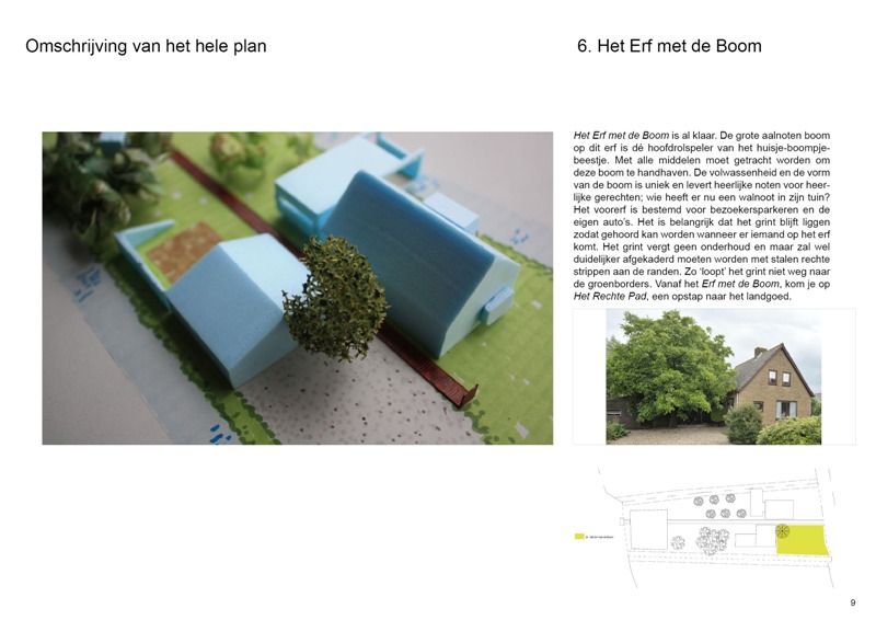 Het Erf met de Boom is al klaar. De grote Walnoten boom op dit erf is dé hoofdrolspeler van het huisje-boompje-beestje. Met alle middelen moet getracht worden om deze boom te handhaven. De volwassenheid en de vorm van de boom is uniek en levert heerlijke noten voor heerlijke gerechten; wie heeft er nu een walnoot in zijn tuin? Het voorerf is bestemd voor bezoekersparkeren en de eigen auto’s. Het is belangrijk dat het grint blijft liggen zodat gehoord kan worden wanneer er iemand op het erf komt. Het grint vergt geen onderhoud en maar zal wel duidelijker afgekaderd moeten worden met stalen rechte strippen aan de randen. Zo ‘loopt’ het grint niet weg naar de groenborders. Vanaf het Het Erf met de Boom, kom je op Het Rechte Pad, een opstap naar het landgoed.
