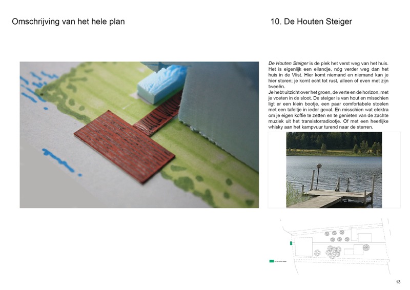 10. De Houten Steiger De Houten Steiger is de verste plek van het huis. Het is eigenlijk een eilandje, nóg verder weg dan het huis in de Vlist. Hier komt niemand en niemand kan je hier storen; je komt echt tot rust, alleen of even met zijn tweeën. Je hebt uitzicht over het groen, de verte en de horizon, met je voeten in de sloot. De steiger is van hout en misschien ligt er een klein bootje, een paar comfortabele stoelen met een tafeltje in ieder geval. En misschien wat elektra om je eigen koffie te zetten en te genieten van de zachte muziek uit het transistorradiootje. Of met een heerlijke whisky aan het kampvuur turend naar de sterren.