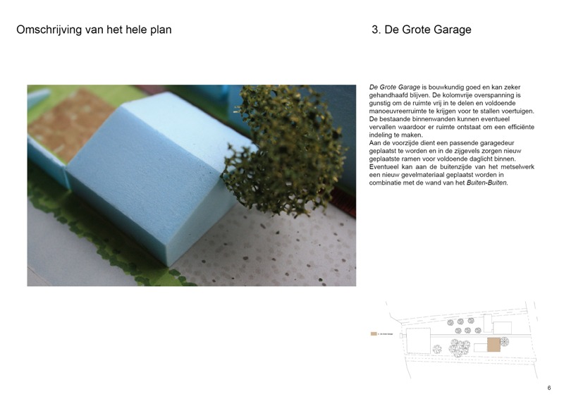 De Grote Garage is bouwkundig goed en kan zeker gehandhaafd blijven. De kolomvrije overspanning is gunstig om de ruimte vrij in te delen en voldoende manoeuvreerruimte te krijgen voor te stallen voertuigen. De bestaande binnenwanden kunnen eventueel vervallen waardoor er ruimte ontstaat om een efficiënte indeling te maken. Aan de voorzijde dient een passende garagedeur geplaatst te worden en in de zijgevels zorgen nieuw geplaatste ramen voor voldoende daglicht binnen. Eventueel kan aan de buitenzijde van het metselwerk een nieuw gevelmateriaal geplaatst worden in combinatie met de wand van het Buiten-Buiten.