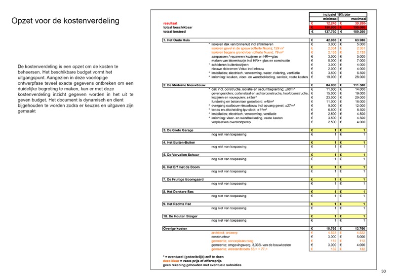 De kostenverdeling is een opzet om de kosten te beheersen. Het beschikbare budget vormt het uitgangspunt. Aangezien in deze voorlopige ontwerpfase teveel exacte gegevens ontbreken om een duidelijke begroting te maken, kan er met deze kostenverdeling inzicht gegeven worden in het uit te geven budget. Het document is dynamisch en dient bijgehouden te worden zodra er keuzes en uitgaven zijn gemaakt.