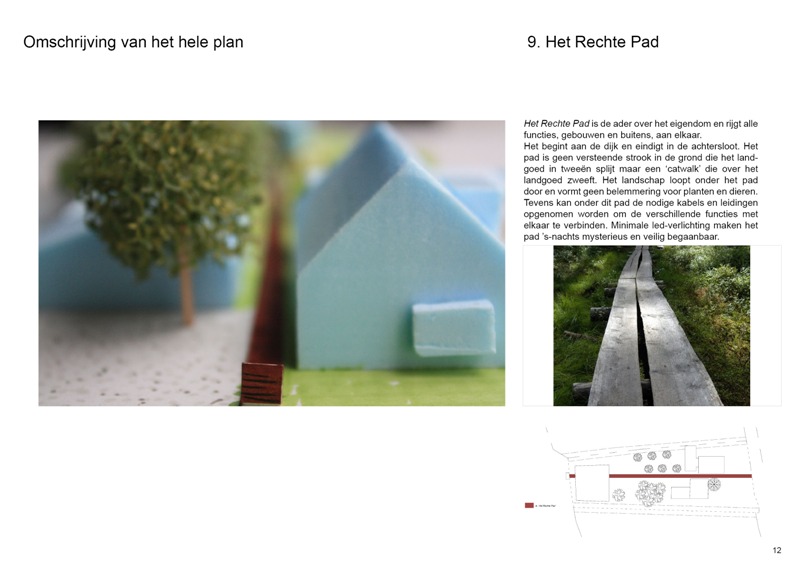 9. Het Rechte Pad Het Rechte Pad is de ader over het eigendom en rijgt alle functies, gebouwen en buitens, aan elkaar. Het begint aan de dijk en eindigt in de achtersloot. Het pad is geen versteende strook in de grond die het landgoed in tweeën splijt maar een ‘catwalk’ die over het landgoed zweeft. Het landschap loopt onder het pad door en vormt geen belemmering voor planten en dieren. Tevens kan onder dit pad de nodige kabels en leidingen opgenomen worden om de verschillende functies met elkaar te verbinden. Minimale led-verlichting maken het pad ’s-nachts mysterieus en veilig begaanbaar.