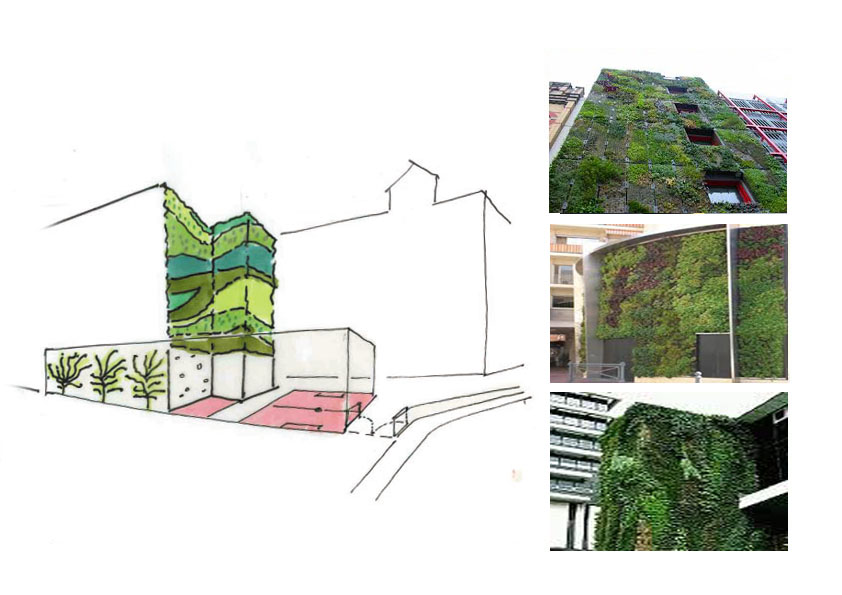 3. De blinde kopgevel van de uitbouw van het Stadsklooster is uitermate geschikt als ‘groene gevel’. De gevarieerdheid aan beplanting en het eventueel ‘s-avonds aanlichten heeft een enorme positieve impact op de omgeving. Dit ’s-avonds aanlichten van deze groene gevel is van wezenlijk belang omdat juist deze gevelzijde een groot zwart vlak is, door het ontbreken van de binnenverlichting van de school in de avonduren.