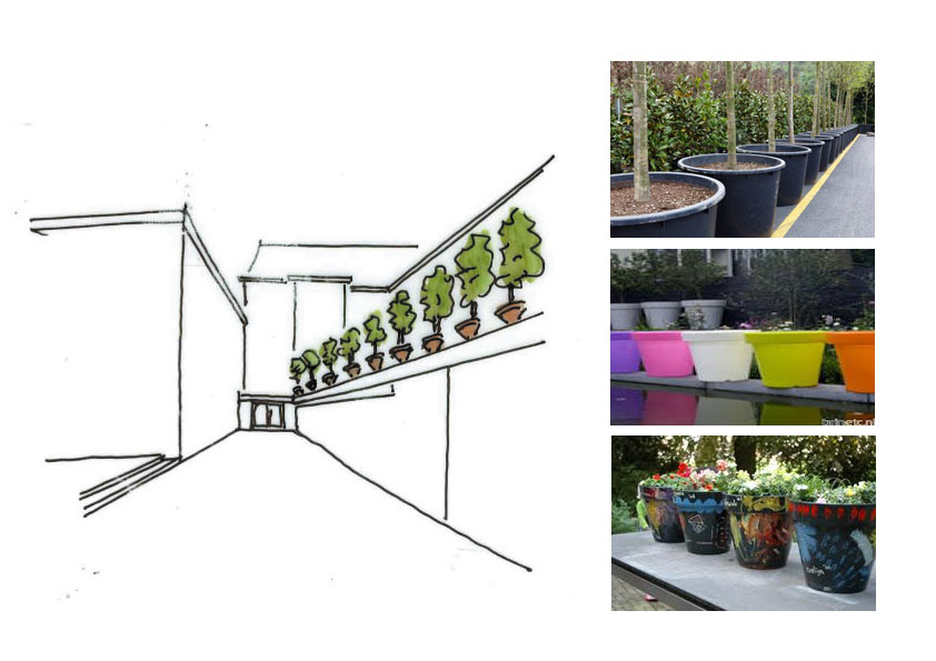 GROEN. Op deze plek is het groen ondervertegenwoordigt; het steen overheerst. Toch is groen hier, op de juiste manier toegepast, van wezenlijk belang om de omgeving te verzachten. Groen kan, indien verkeerd ingezet, de onveiligheid vergroten. Juist hier is het belangrijk dat de sociale controle op het plein verbeterd wordt. Wij stellen een aantal groene ingrepen voor die noodzakelijk zijn om te verbeteren.