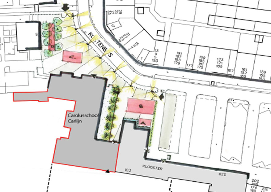 PARKEREN. Wij vinden dat de inrichtingsvlekken als aangegeven op bovenvernoemde tekening verbeterd kan worden. Met name het eigen parkeren, de 2 entrees van het stadsklooster en de noodzakelijk afscheiding ervan en het gevolg voor het bewonersparkeren, is geen verbetering op wat er nu is. Er dient een eenduidig parkeerveld te wordt gemaakt waarbij het parkeren van de school en het bewonersparkeren in één ruimte wordt ondergebracht. De wanden van deze ruimte worden gedefinieerd door de gevels van het klooster en niet meer door hekken. Het eigen parkeren van de school wordt afgesloten van het openbaar parkeren middels afsluitvoorzieningen (slagboom, poller of beugels) waardoor alleen de leraren deze kunnen gebruiken. Tevens kan deze ontsluitingsweg voor het eigen parkeren gebruikt worden als ‘kiss and ride’ voor de ouders waardoor opstoppingen aan de Kortenbos worden vermeden. Door het opnieuw aanleggen van de vernauwde doorstroom op het trottoir aan de Kortenbos vervallen 3 openbare parkeerplaatsen maar door de gedeeltelijke herinrichting van het parkeerveld in combinatie met het eigen parkeren, worden er 7 openbare parkeerplaatsen bijgemaakt.